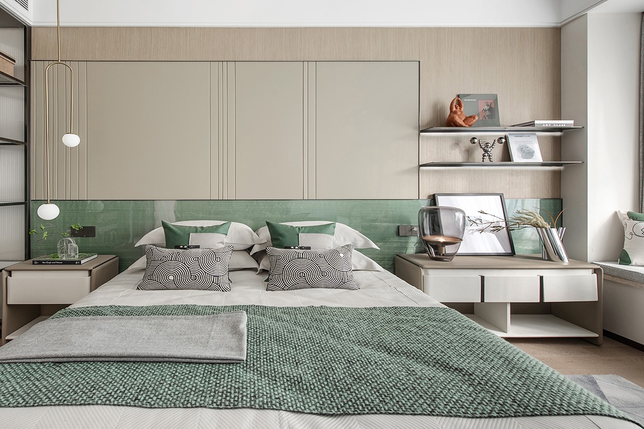 卧室,给人一种超脱自然的沉静之美。墨绿色系的床品让视觉在空间整体上呈现一致,再配以不同深浅的奶茶色及灰色,创造出空间的层次立体感,温暖的灯光点缀其中,平衡沉静的冷冽感。精致灵巧的摆件更是为空间注入生机活力,形成一种既温馨又调皮的氛围。
