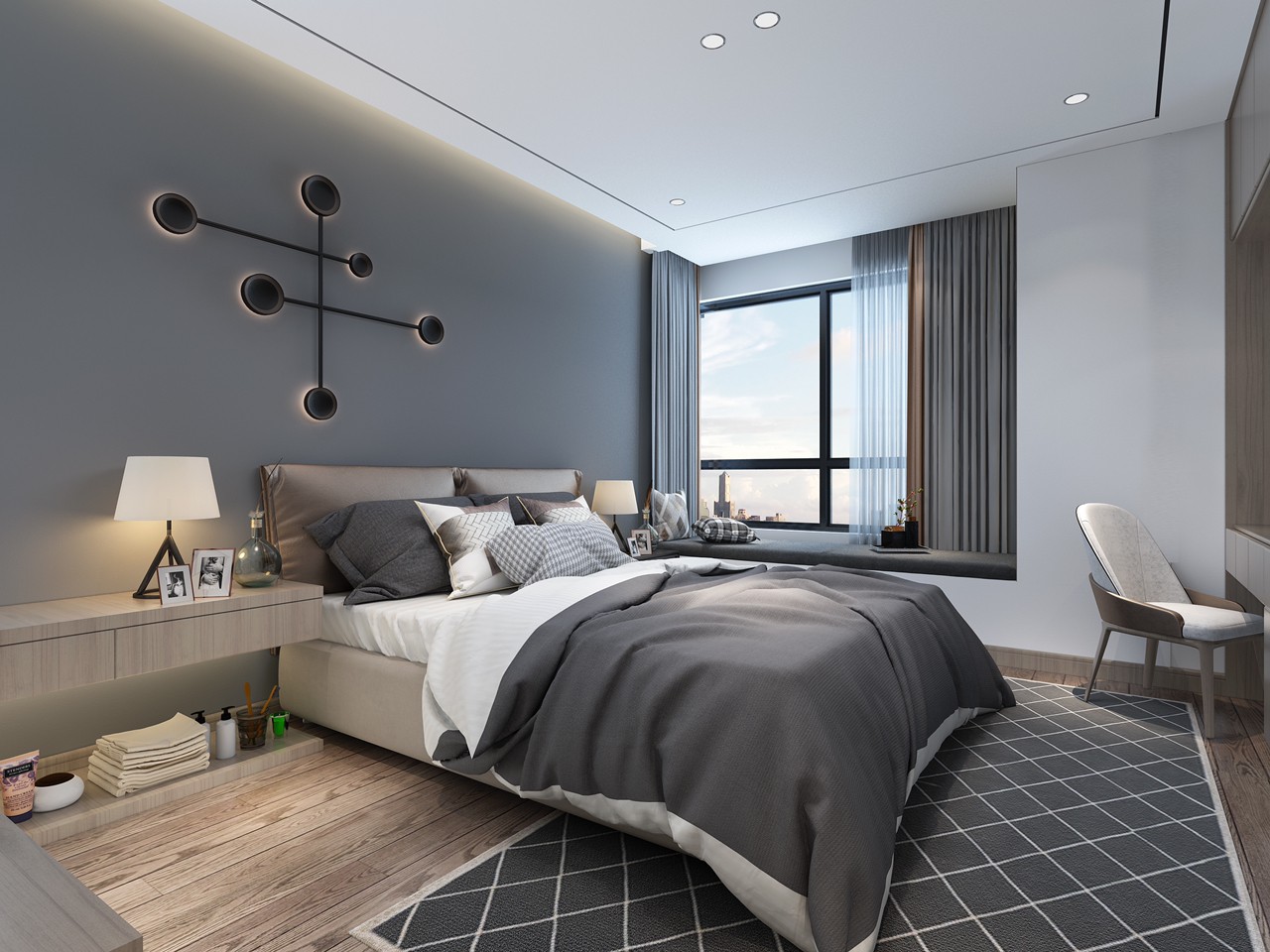 主卧以烟灰色为主色调,再搭配原木色的家居,在清冷空间里增添了几分温情。床头的壁灯更是极具设计感,凸显了主人品味高雅。