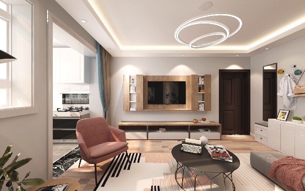 客厅定制电视柜简洁大方且美观,集展示储物于一体,原木色与白色搭配,清爽干净。