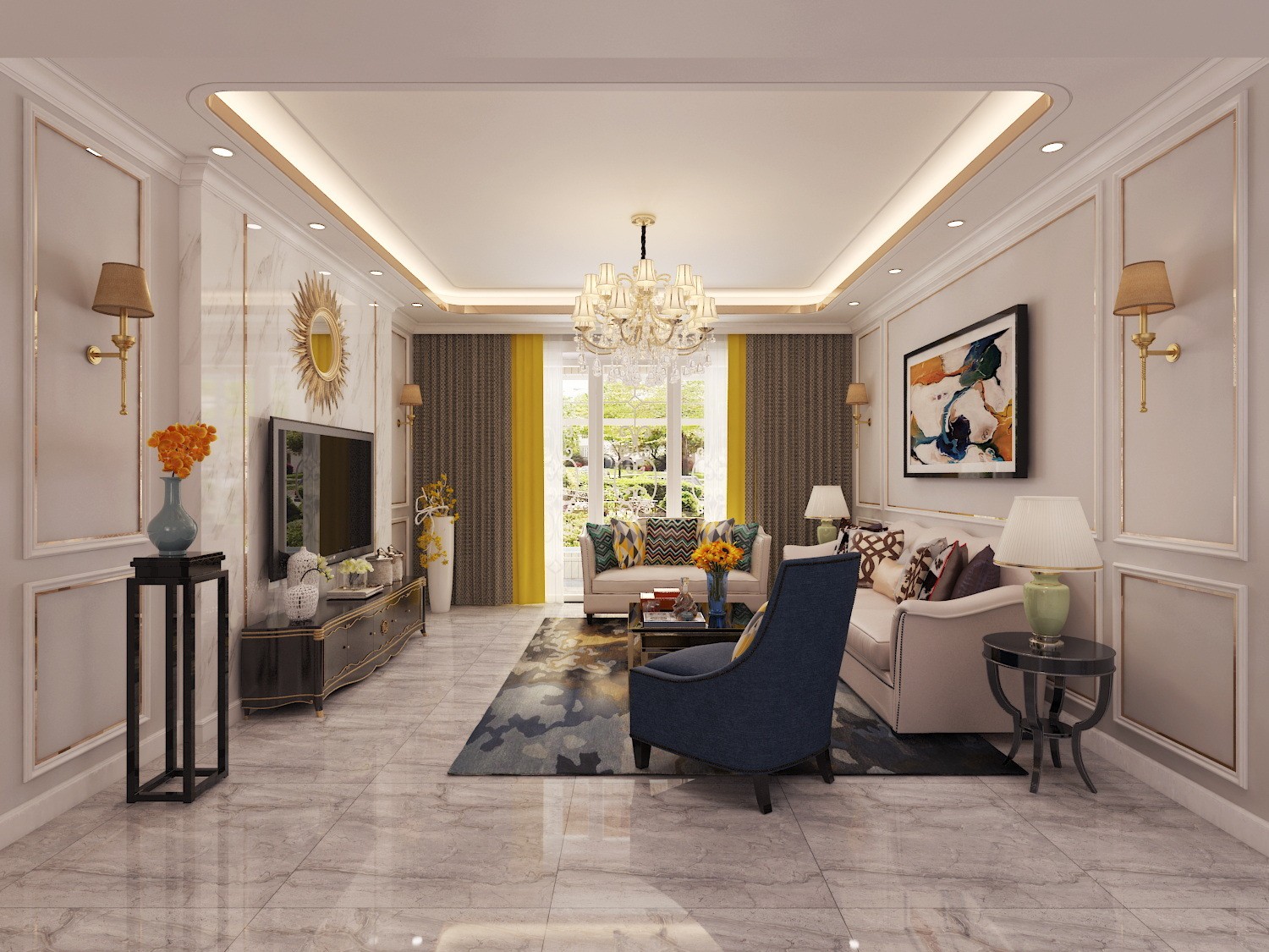 空间的无限延伸,墙面的简约处理,金色的线条、大理石,奠定空间的庄雅低调,