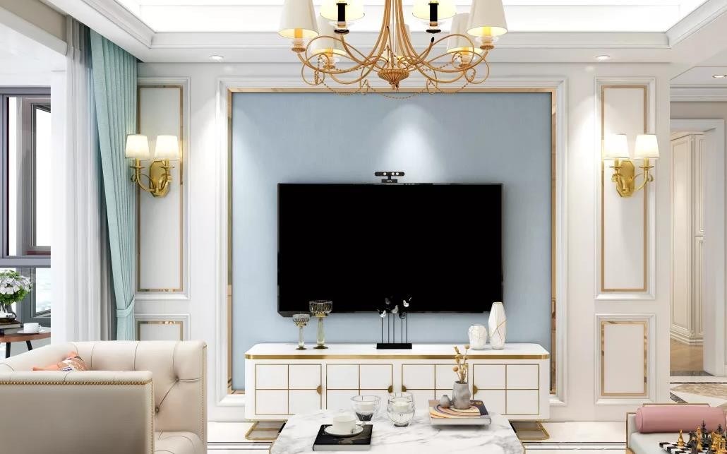 客厅为白色色调,简约不繁华的吊灯,淡蓝色的电视墙,蓝色的窗帘,白色的柜子,整体简单。