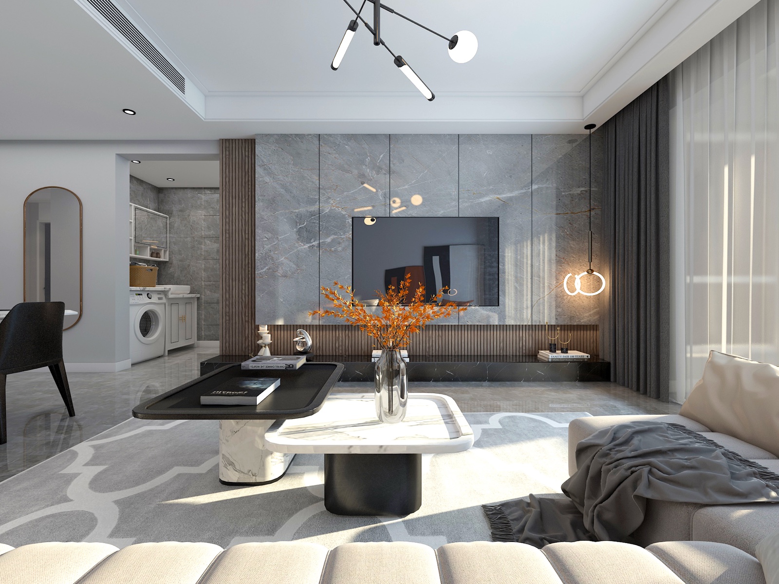 客厅以现代风格为主要风格 电视墙由瓷砖大板搭配木格栅 整体突出现代风格的简洁大气