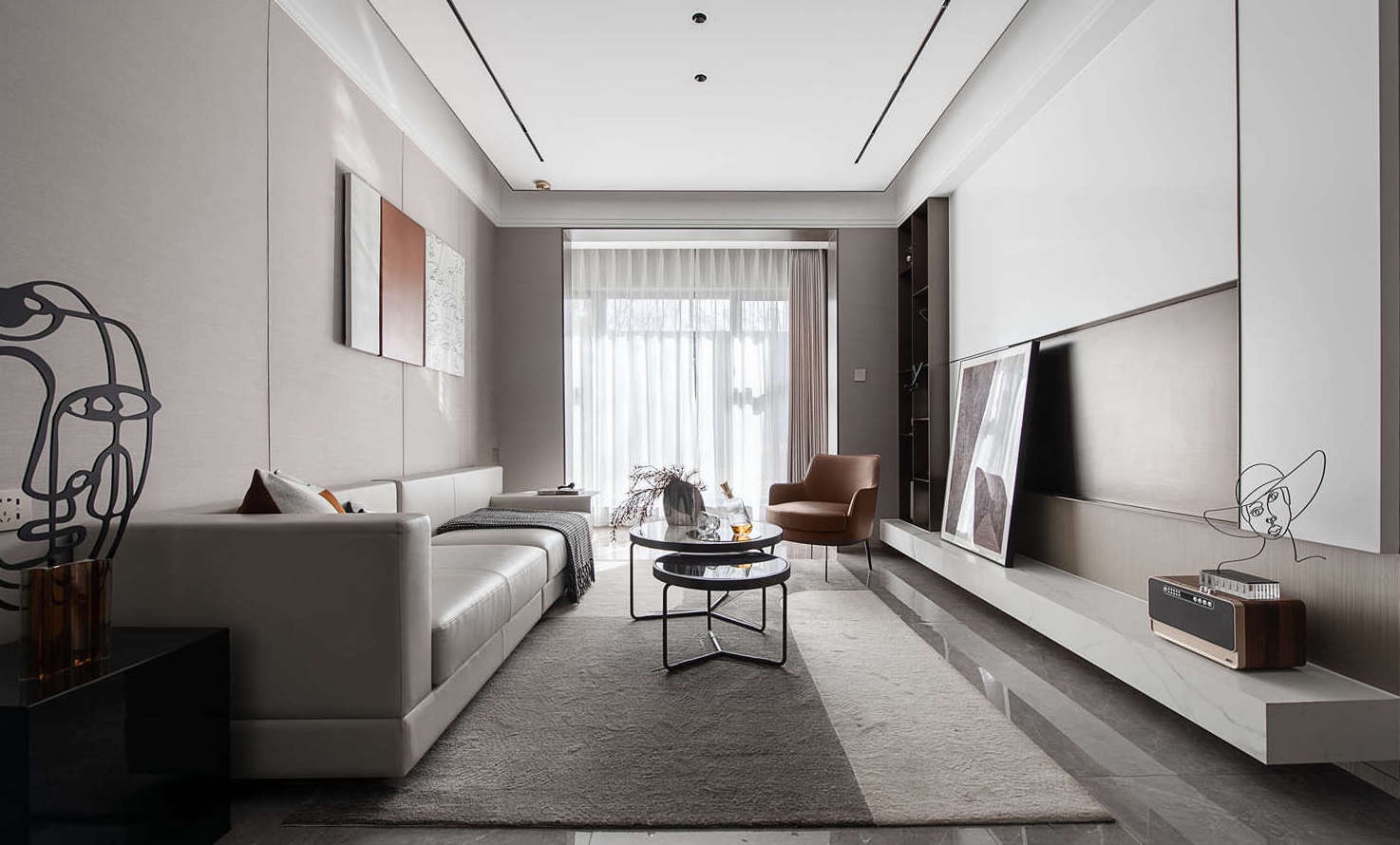 客厅作为会客交流中心,亦是家人徜徉时光的主要空间。以冷静克制的黑白灰为基础色,大地棕为辅色,局部点缀卡曼橘色。