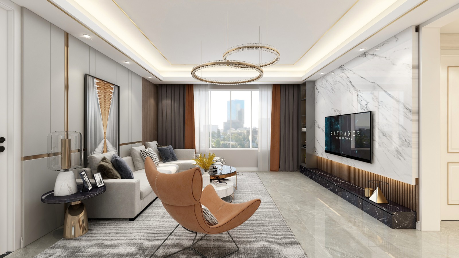 客厅整体大面基调采用浅色系,地面采用750*1500大地砖大气沉稳,顶面金属元素点缀,极具轻奢感觉。