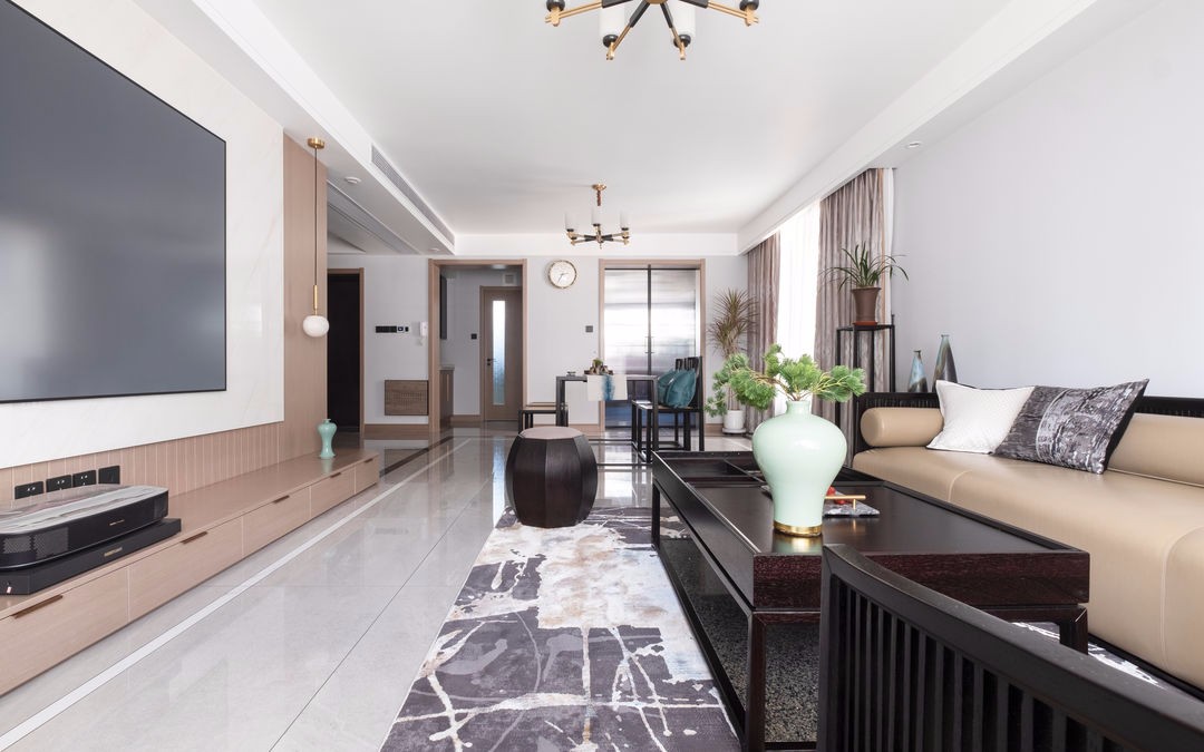 客厅线条简约流畅,不同材质的运用和碰撞,凸显新中式风格特有的质感和美感