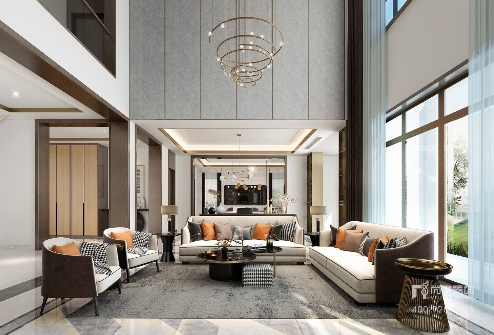 本套别墅装修案例是龙池山庄,采用的是现代轻奢风格,别墅设计师是董自起。 空间以现代奢华材质为主,在软装材料的选择上,运用有特殊质感的家具面料如丝绒感及皮革等。为结合硬装设计,家具选择主要以金属、灰镜及深木饰面为主,结合金属大理石等艺术品做点缀,整体空间中透露着低调奢华的氛围。