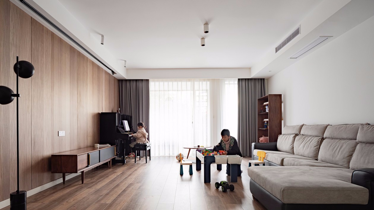 电视背景墙采用了通面木饰面的设计处理,简洁舒适。妹妹弹琴,哥哥玩积木,暖暖的居家感~