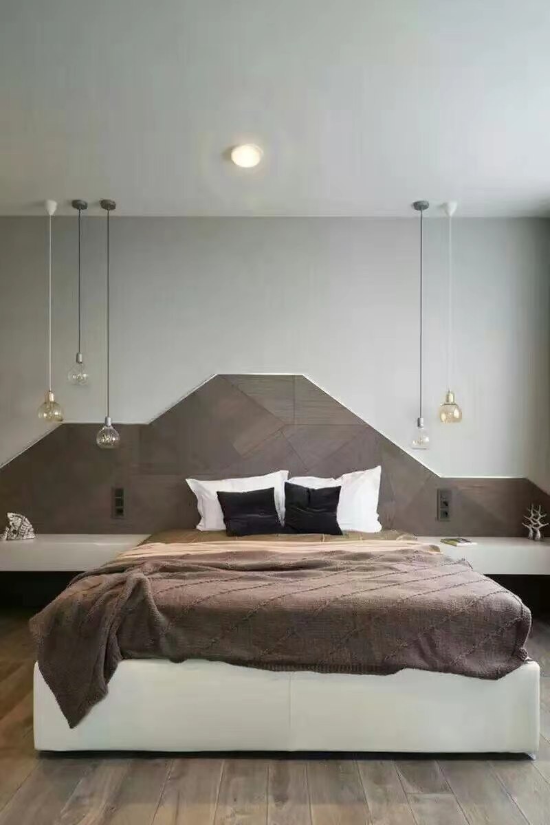 平定设计,床头背景用地板订做,简洁而大方,床头柜用木制订做,看起来与床以及背景连为一体,增加原本窄小空间的视觉效果