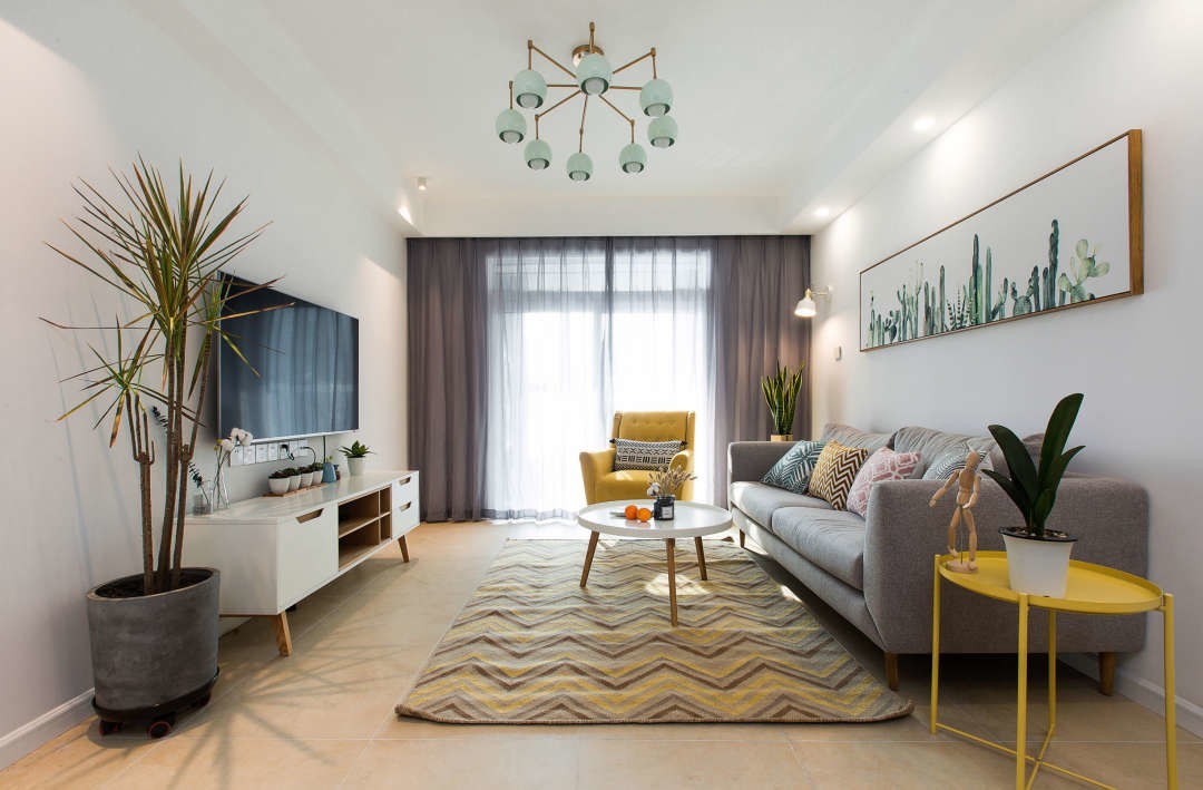 客厅没有做任何墙面造型,墙面就是最简单的白色乳胶漆,浅灰色三人沙发搭配姜黄色单人沙发,简单的装饰画作为点缀背景,整体的氛围安静舒适。