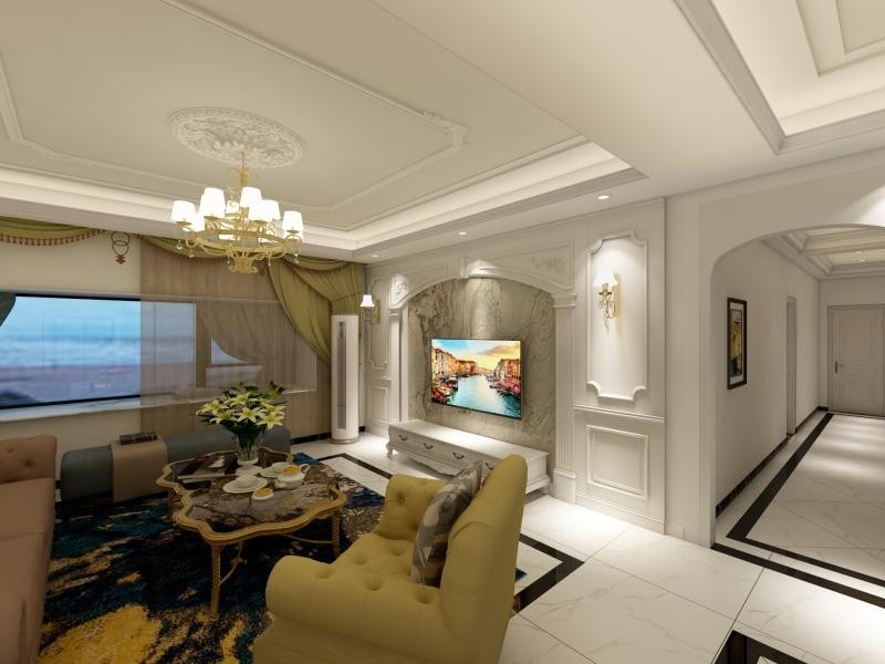 整体色彩明亮,线条简洁,包括吊顶的层级也十分简单,只是用了一个石膏线灯盘来增加欧式的情调