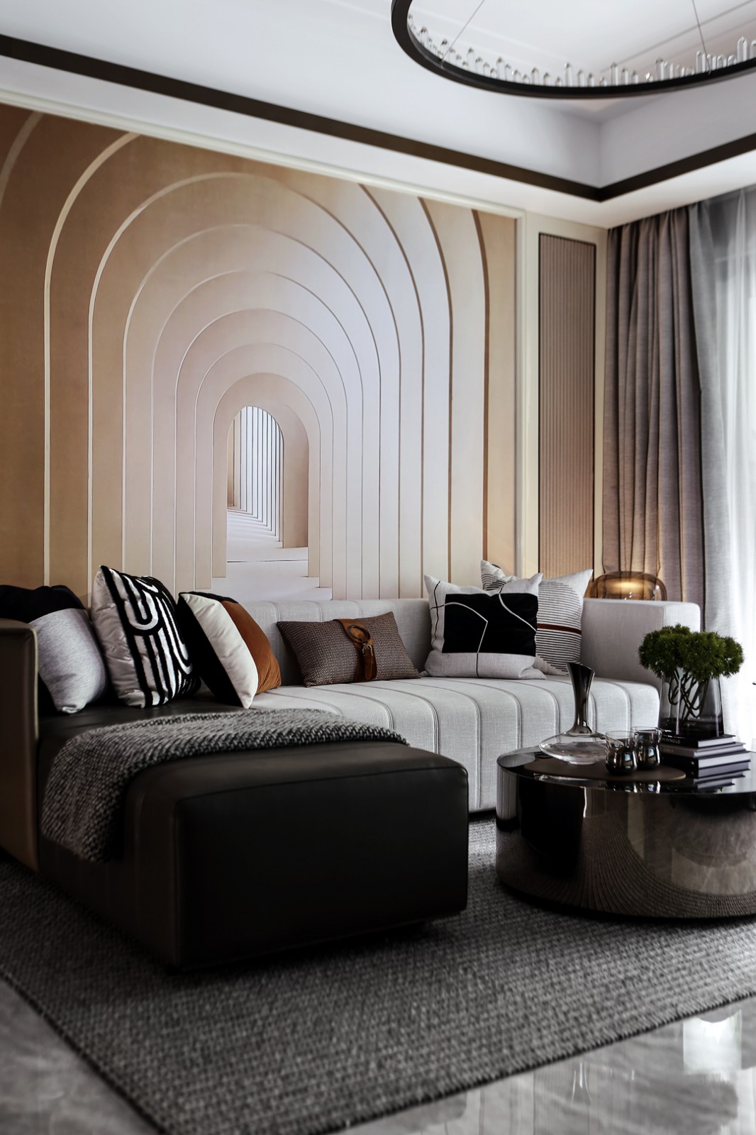 客厅以深浅有序的灰色作为空间主调,辅以轻橘色、少许米色,打造***、品质、前沿的空间格调。设计赋予了空间新的生命,也对高品质生活做了诠释和向往,但除去物质,重思想的传承是本项目空间的主导。延伸感极强的建筑图案墙纸,包揽了近乎整个客厅墙面,直接带出了空间的主旋律。