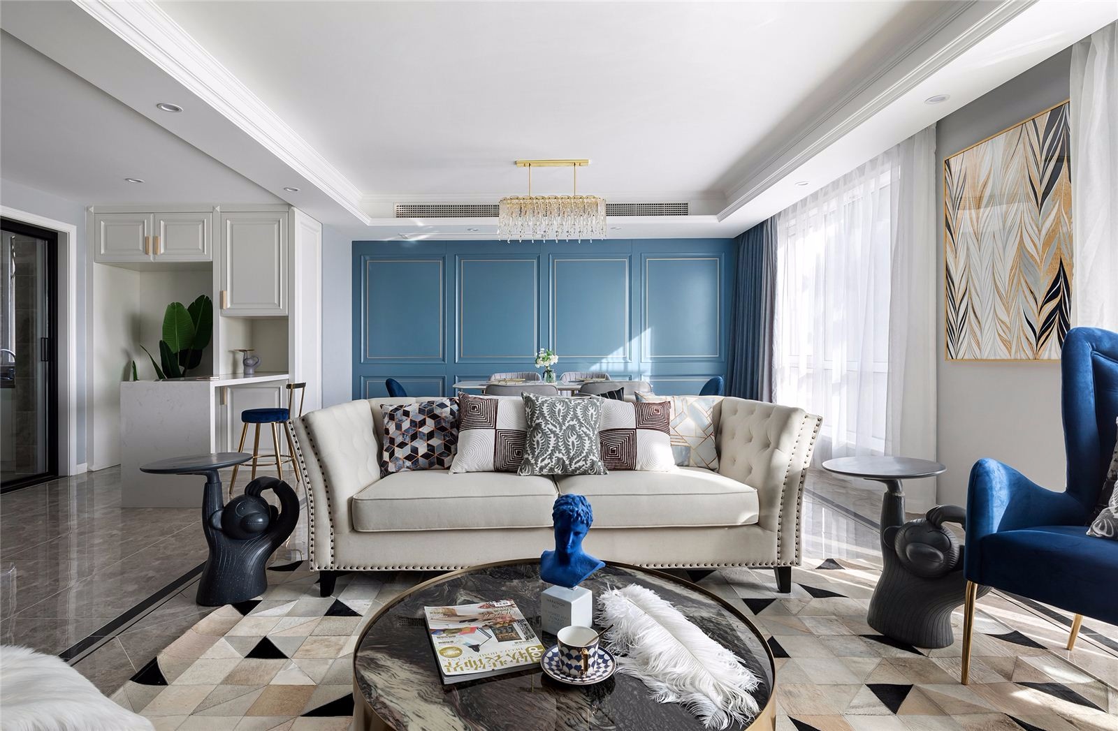 喜欢主卧的质感, 蓝色的床头背景总让我想到静谧的大海, 这张单人沙发椅就是楼下客厅原来卖家按错颜色的那张哦,放卧室也很美。羽毛的墙布和床头柜上羽毛的装饰很呼应哦。