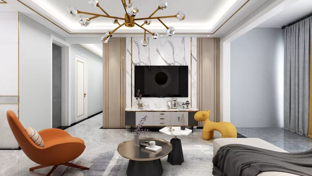 这是一张现代轻奢风格客厅图,简洁 这种装修风格的主体装修比较简洁,但也不像现代简约那样随意,用于装饰的金属线条,给人一种低调奢华有内涵的感觉