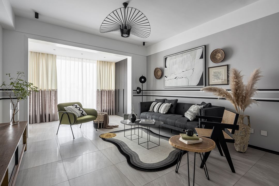 墙面以白、灰为主,纹理自然的灰色磁砖贯穿整个空间。在拆除阳台推拉门后,变得通透敞亮。