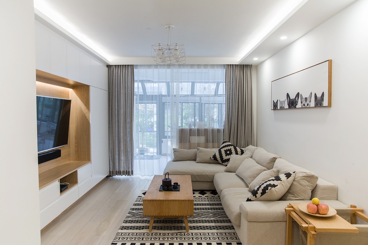 客厅设计的非常简约,暖灰色地板,棕色皮沙发,中古落地灯,对称吸墙音箱,三星电视机,一个黑色电视边柜。非常有特色的是这个白色拱门,打破方正传统设计,降低家的锐度,透过拱门看一切,目光都会带上温柔。