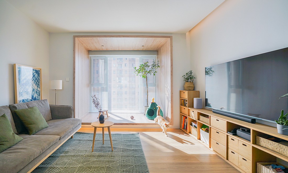 客厅将中间大部分都空了出来,留给小朋友足够的活动空间。把阳台并入室内,做成了一个木盒子的形式,扩展空间的同时也会多一些趣味。