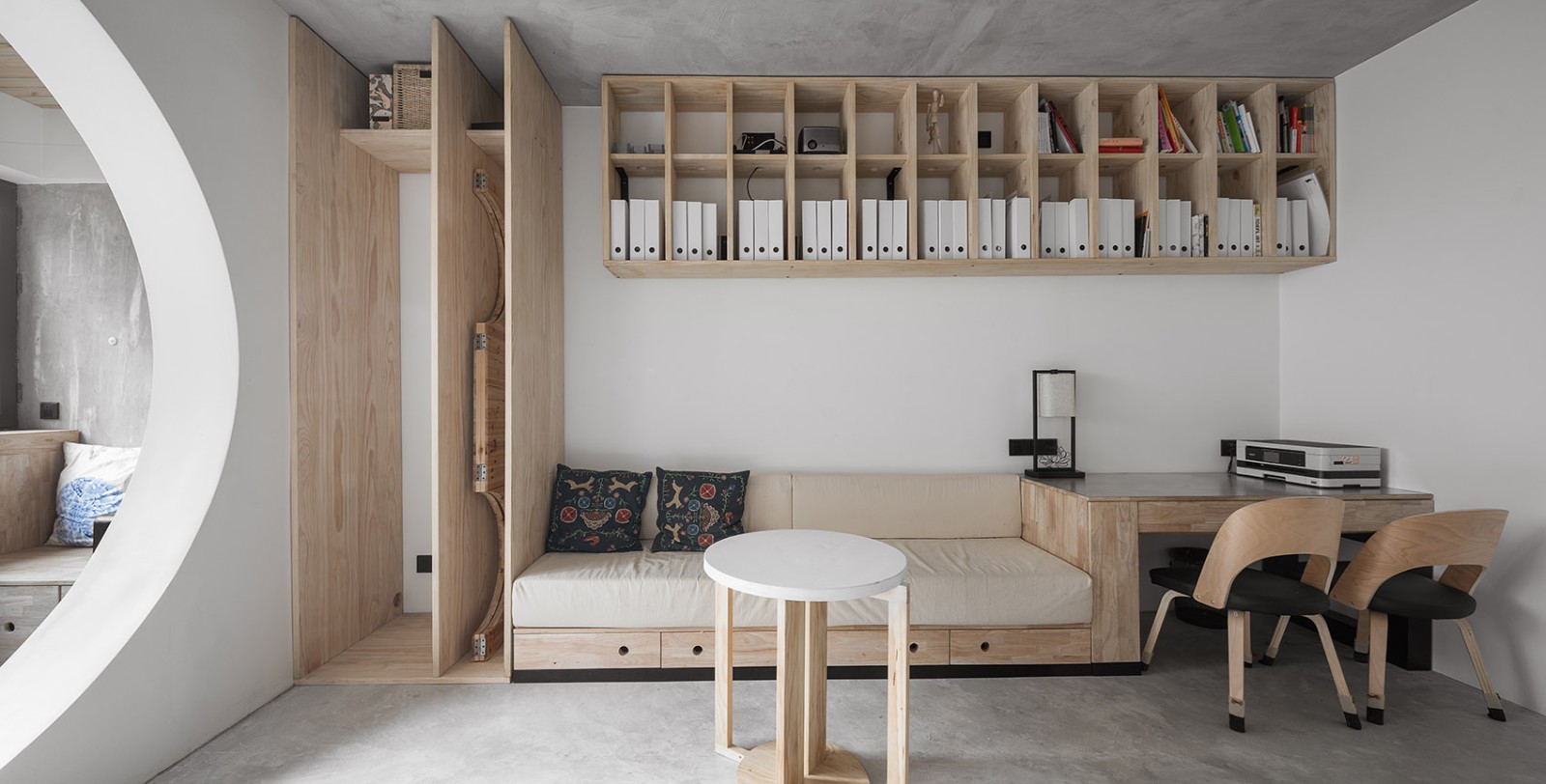 原木与暖白的交错组合,保证了日常物品的收纳