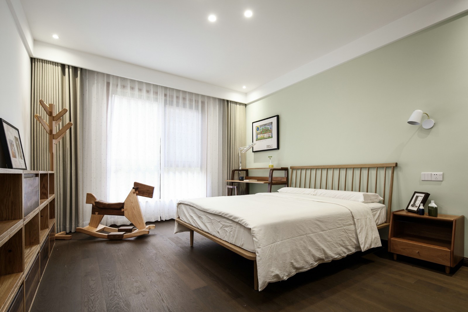 卧室沿用原木色系,墙上的壁画是最为巧妙存在,虽是耀眼的跳色,但又显得恰当十分。