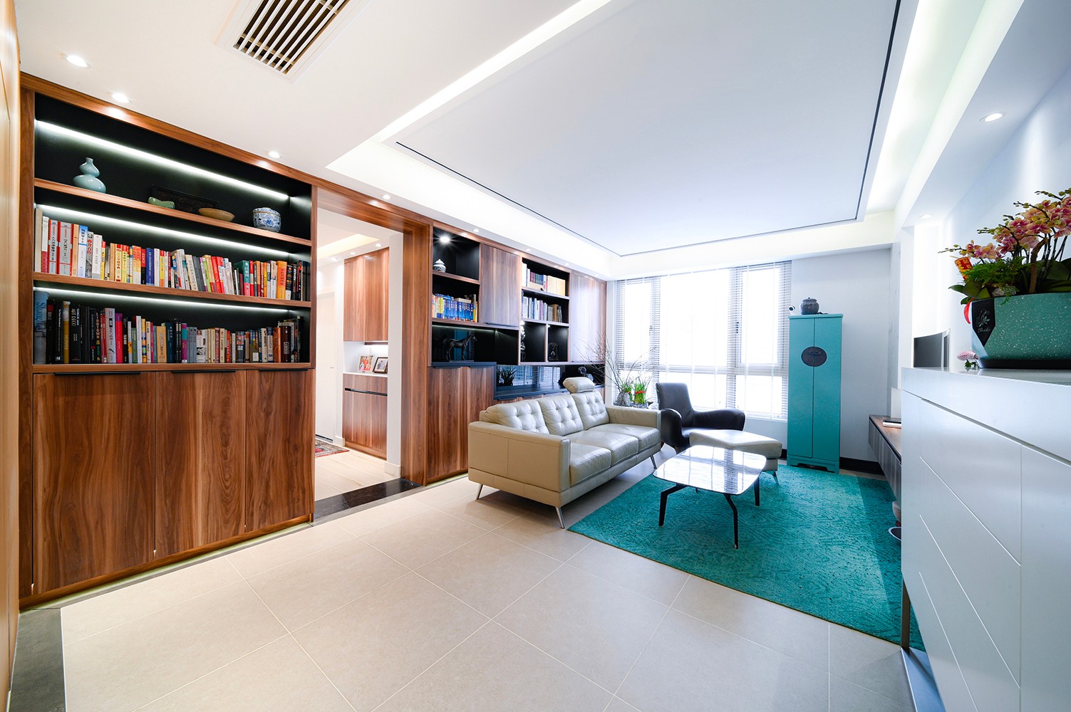 客厅背景墙打造成书柜与储物柜结合的模式,既满足业主要求的书柜又满足了储物功能。