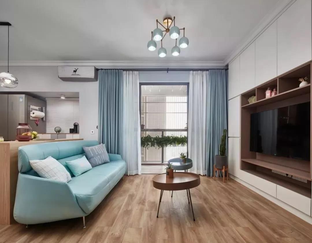 浅蓝色的小沙发格外吸晴,让人觉得很温馨。电视背景墙是嵌入式收纳柜设计,把电视机融入其中,大方又实用。
