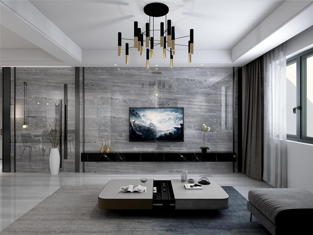 客厅电视背景墙采用食材上墙,搭配整体的风格,体现出现代轻奢,***灰的时尚大气!