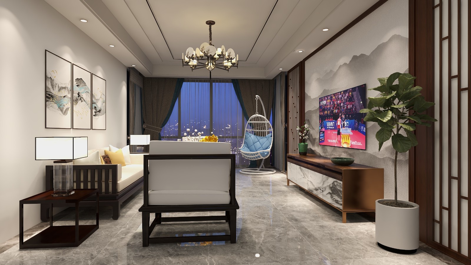 新中式客厅,木格栅+大理石背景,顶上木线条装饰,简单又不失庄重