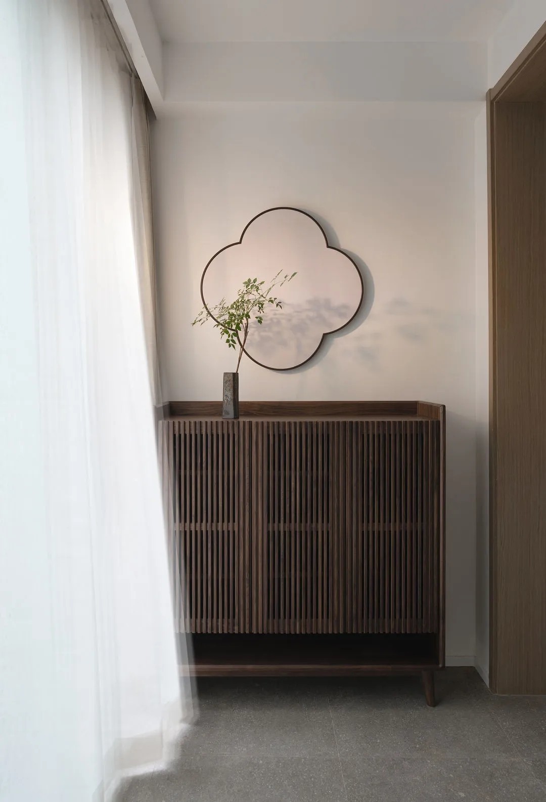 阳台改成链接客厅与庭院的门厅梅画框轻描淡写着江南园林的素雅之美。