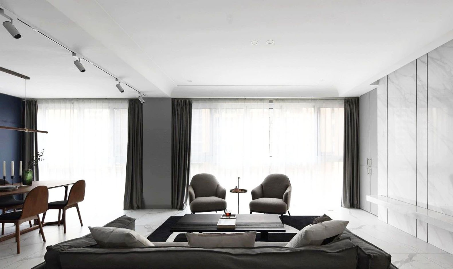 冷色调的空间,通过温润的木质餐桌椅来中和,灰色玻璃吊柜用于藏酒