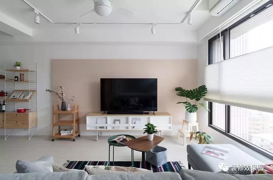 客厅,沙发背景墙设计一堵半高墙体,通过玻璃窗和推拉门的处理方法保证了室内的采光及通透性,在光的折射下,创造出质感上的变化,也让空间更为简约时尚。