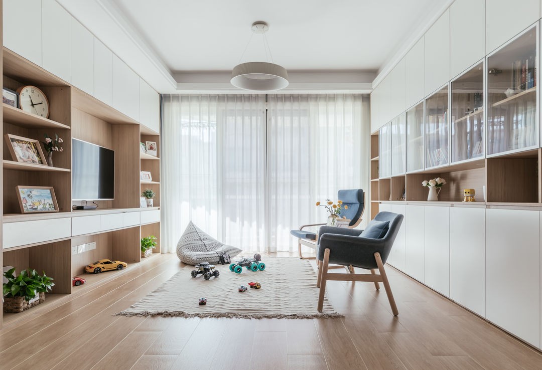 客厅的墙壁选择了整体柜的设计,原木色柜体与简洁的哑光白色平板组合。为了避免空间过于单调,选择了柔软的中性色调单人椅,简单温馨又不失趣味。