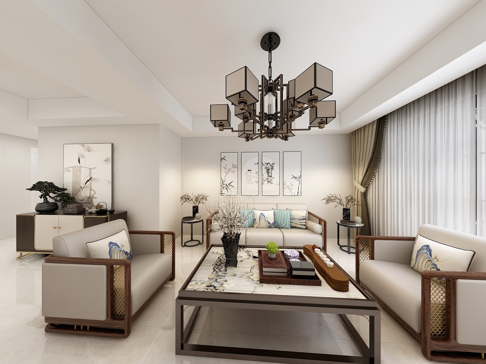 本案定位于新中式风格,客户喜欢中国传统文化,喜欢端庄清雅的家具,屋里收藏各类中式瓷器,对生活追求精雕细琢。