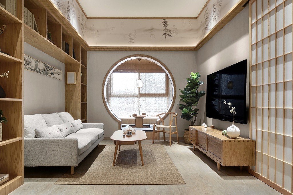 客厅通往茶室的入口运用了类似中式明清风格的月洞门,和整体偏向的日式风格也吻合。