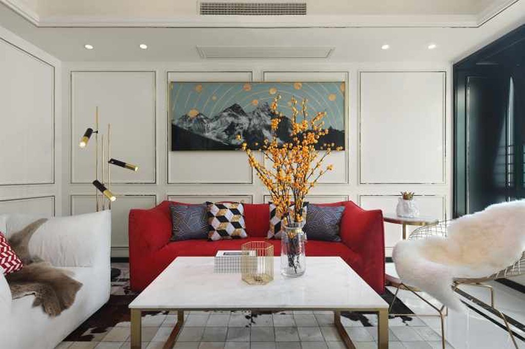 白色的护墙板、爵士白的地砖搭配鲜红色的沙发,犹如冬日雪景中绽放的玫瑰,绝美冷艳的气息喷薄而出。客厅的沙发,其实是前面一套房子的旧家具。