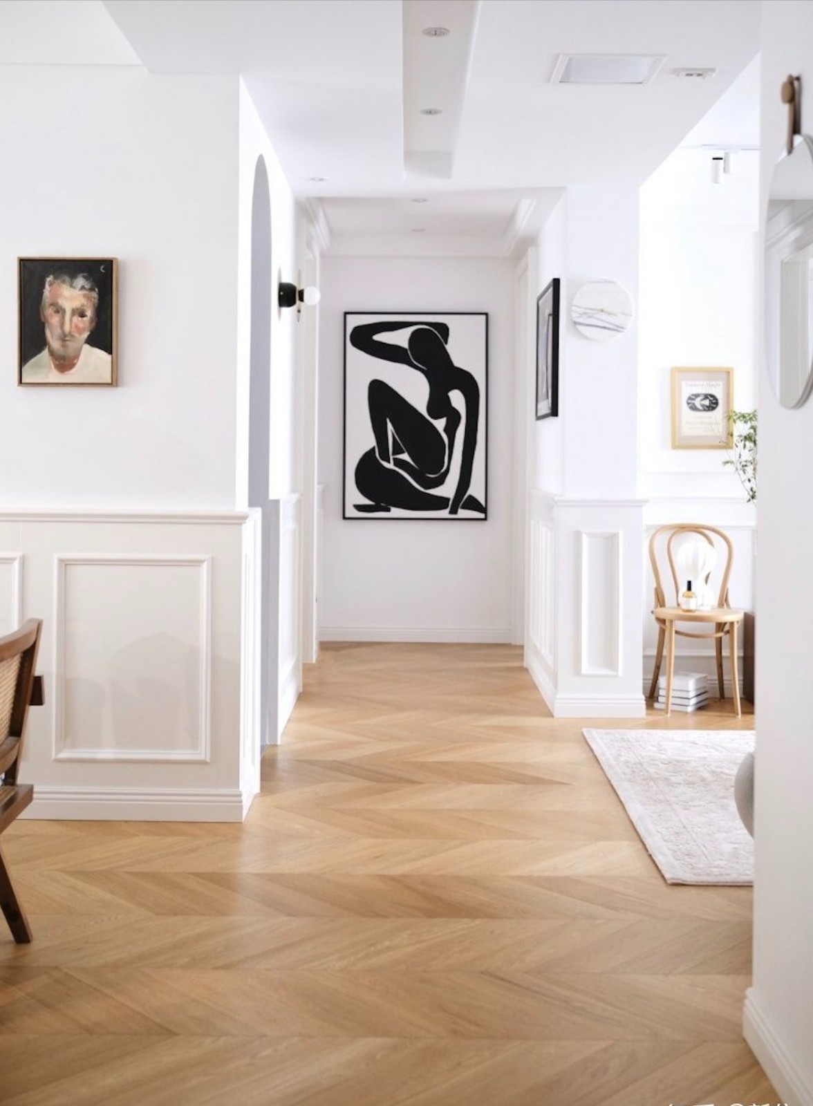 玄关抬头***眼,可以看到走廊尽头的一幅抽象画,铺垫了整屋复古摩登的基调,地面的鱼骨地板,也十分的清爽洁净。