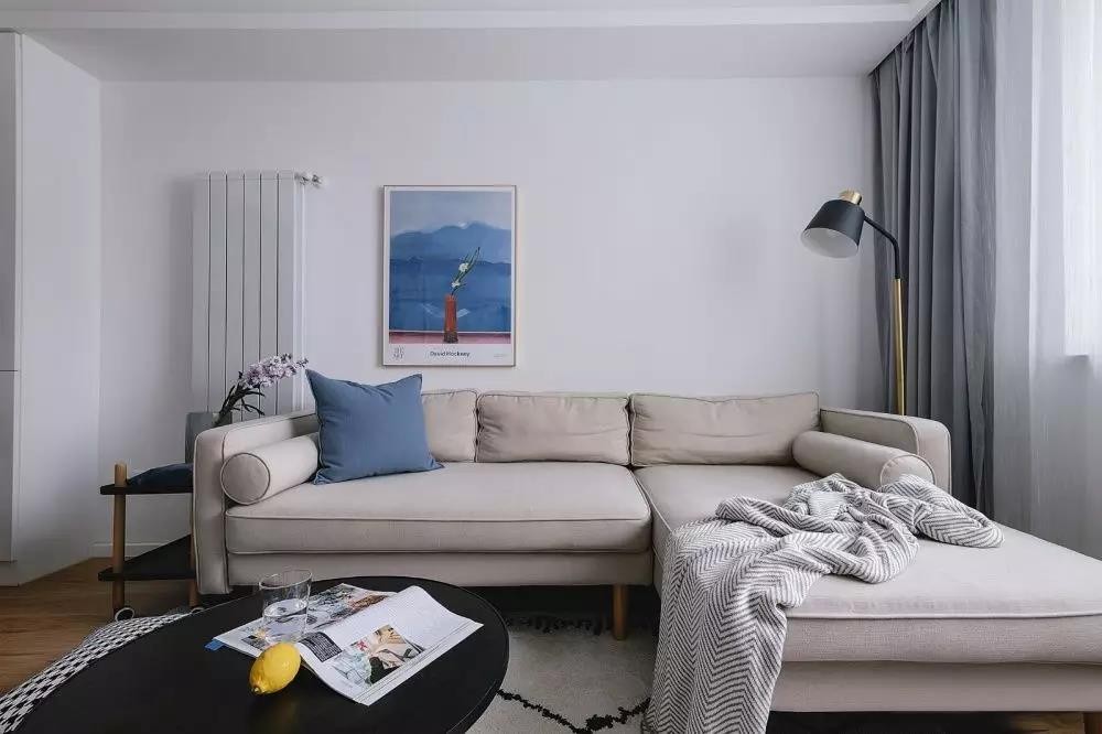 米白色的L型布艺沙发柔和而内敛,线条感极强的落地灯,洋溢着极简主义的浪漫