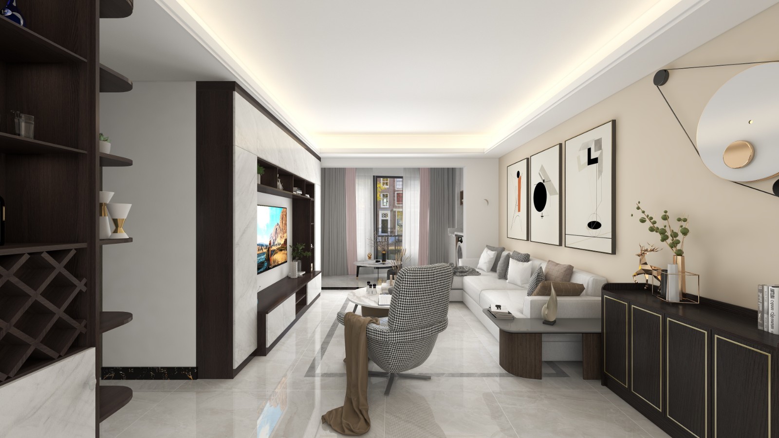 本案为轻奢,是在现代风格黑白灰的冷峻中加入金色调和。它比***简约风格更注重品质和设计感,向人们透露着生活本真的自然和纯粹。
