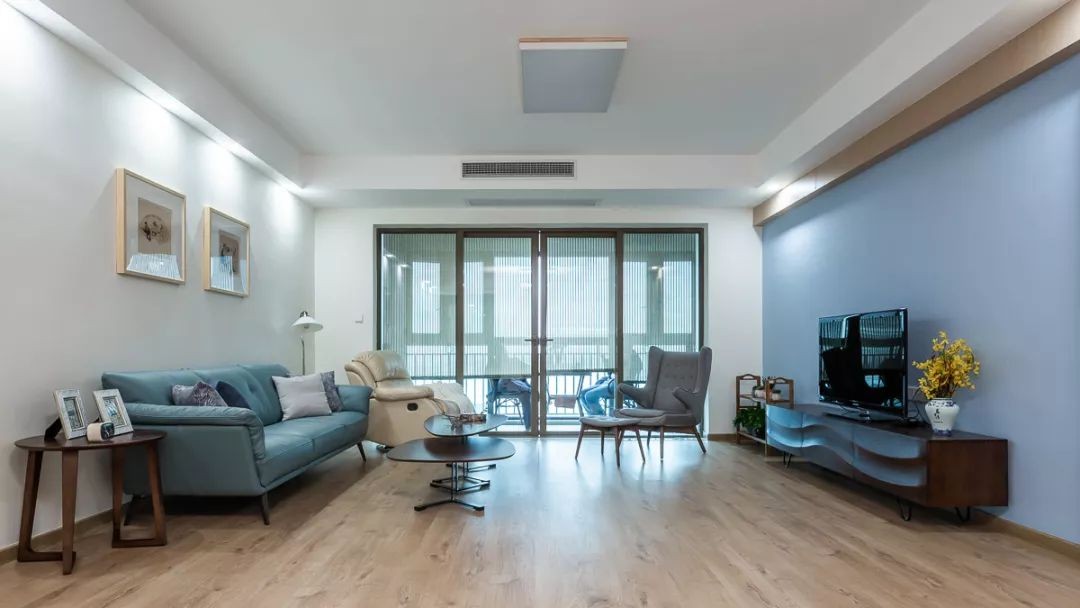 ▲客厅的宽度相对宽松,摆上沙发茶几与休闲椅后,还留出了宽敞通道,以木质地板+简约的墙面天花造型的设计,再以素雅淡蓝的软装与墙面搭配,呈现出一个安静华丽的舒适空间感。