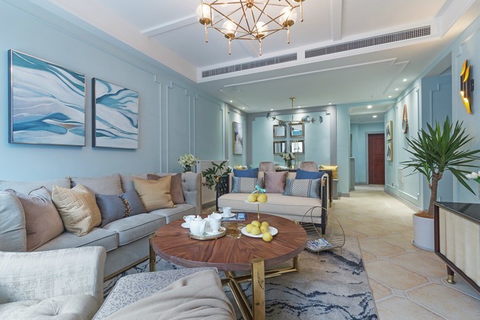 使用了业主非常喜欢的水蓝色作为整体的主色调,家具以及其他软装也围绕着蓝色进行整体搭配,同时加入了一点金色、灰色作为点缀,提升了整个空间的精致度,体现浓厚的艺术气息