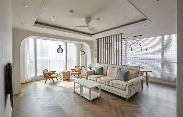 客厅,整体以米色系为主,给人一种大方的感觉,米色沙发搭配人字拼地板,家具都选择简洁的款式,看上去干净又温暖。