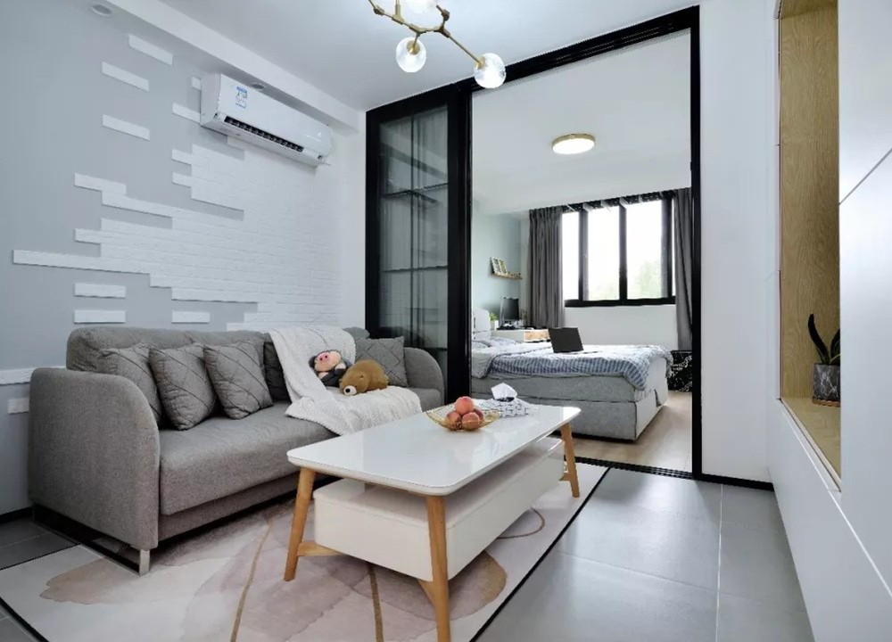 客厅与卧室之间拆除了原本的分隔板,用半透明玻璃滑门来替代,滑门推开以后自然光直接进入客厅,并可以通过无遮挡的过渡区,直接照进房间大门,整个屋子都不会存在昏暗的情况。