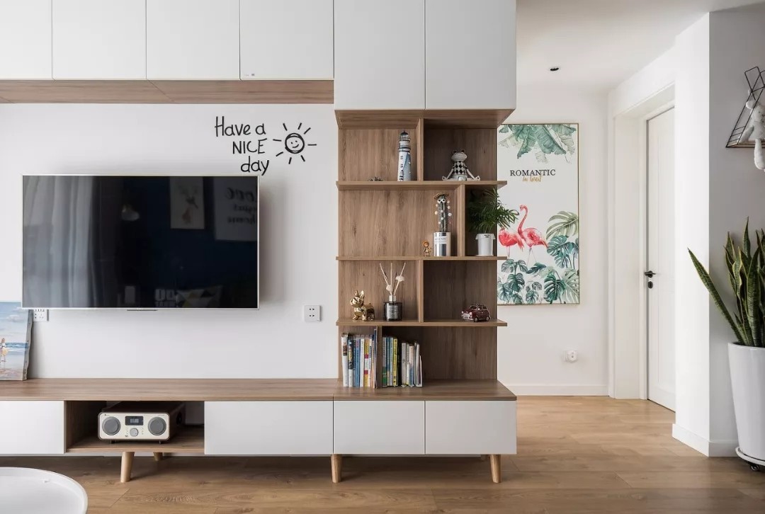 电视墙采用白色打底,原木色调搁架和柜体,提升了客厅空间的储物功能;电视右上角有一句***的贴画:“have a nice day”,每天出门看到这样一句话,整个人都会元气满满的。