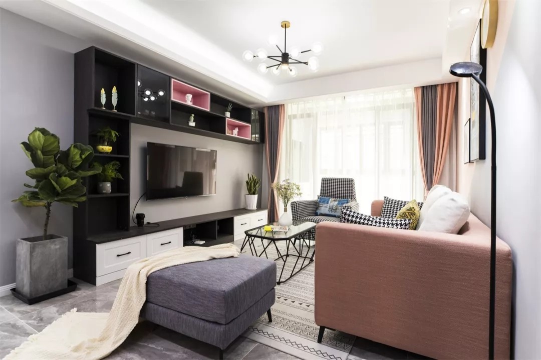 走过玄关就到了客厅空间,沙发背景墙和玄关墙面集合起来,这种灰色和藕粉色搭配的拼色墙,很好看。