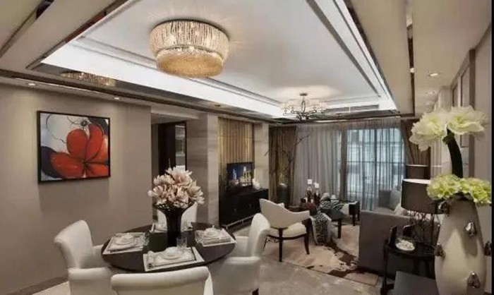 客餐厅为一体设计,两个空间统一做成一个大的跌级天花吊顶,然后再用不锈钢收边做造型,不仅丰富了天花,而且二级的处理手法让空间看起来更高