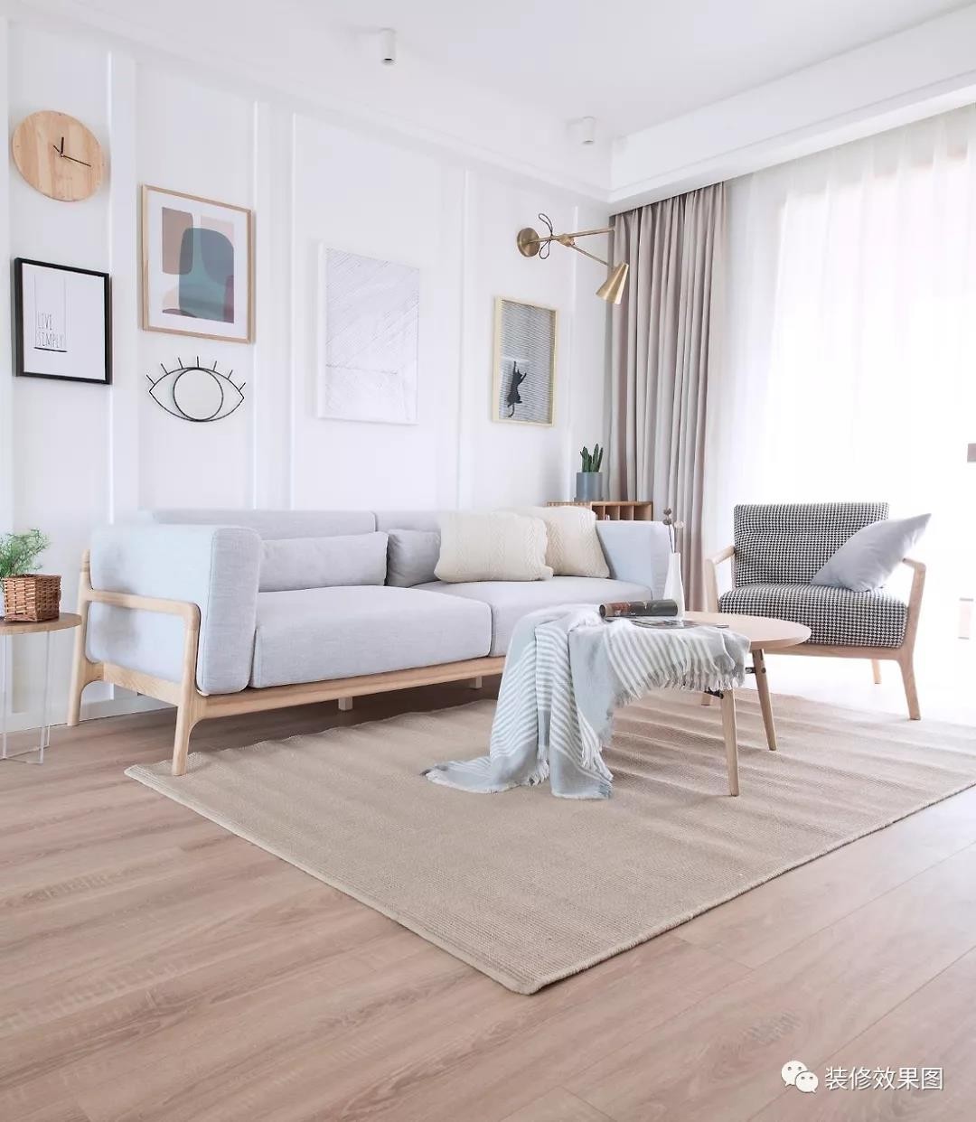 客厅从日式和北欧的干净简约出发,利用棉、麻及原木等天然材质,烘托出自然、轻松的氛围。