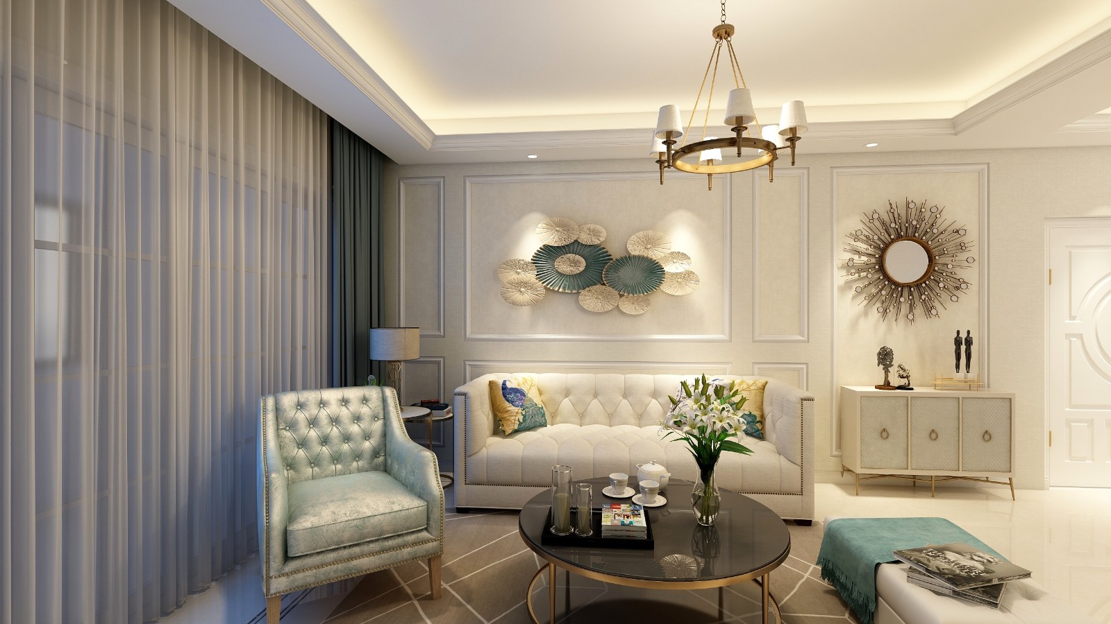 客餐厅大开间设计,加强空间的开阔度,使其显得更大气、美观,简单不繁琐的石膏线条的应用。