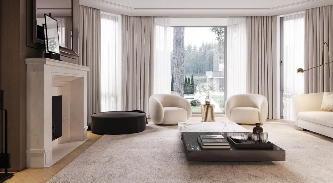 客厅非常大方,白色石材的壁炉与深色的收纳柜作为整体。