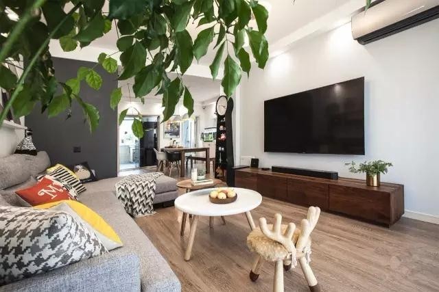 客厅整体装修简洁清新,极简的茶几电视柜,电视墙刷上淡蓝的乳胶漆,壁挂电视+木质电视柜,整体令人惬意又舒适轻松。
