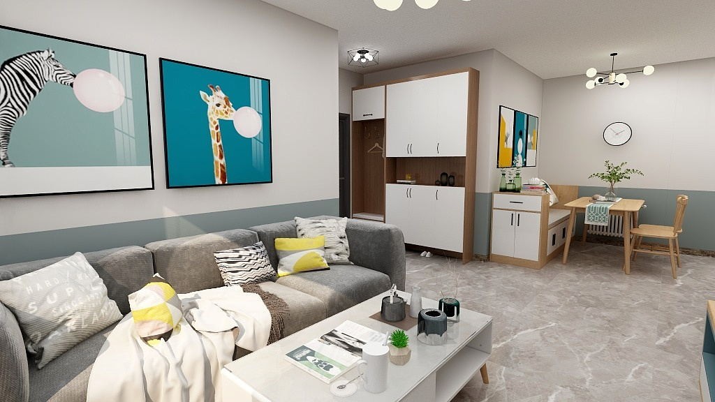 灰色布艺沙发与原木和白色相结合的茶几打配,便整个空间提亮不少。 与餐厅相互辉映,相得益彰。