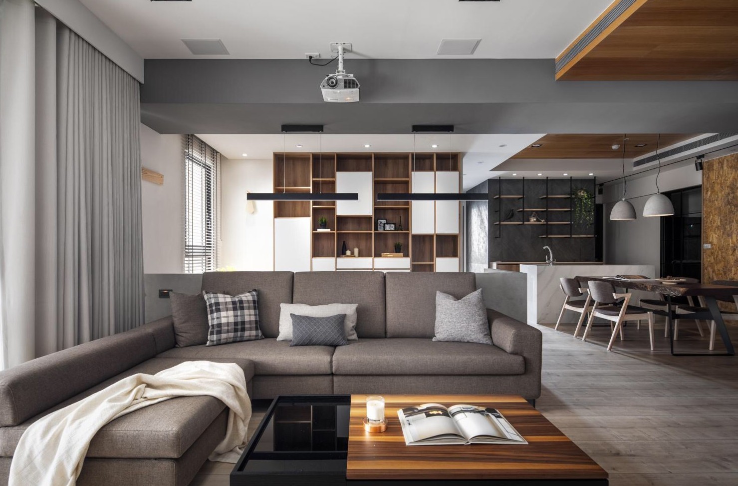 客厅影音设备完整,包含投影机及内崁多声道音响系统,在家即可享受剧院级影音效果。 客厅天花板特别拉高增添空间开阔感并延伸至窗外,电视墙以清水模搭配实木台面带出主墙的朴实又俐落的质感,后方开放书房为整体空间增添文青气息。