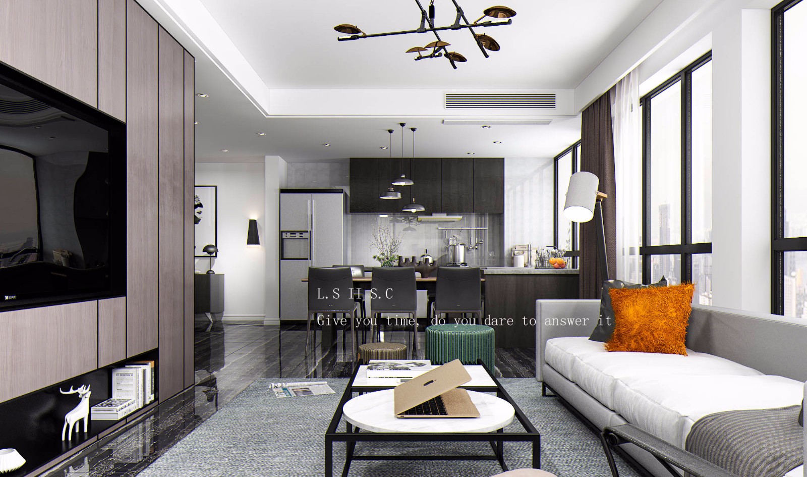 现代黑白灰主调,落地窗开阔了客厅视野。
